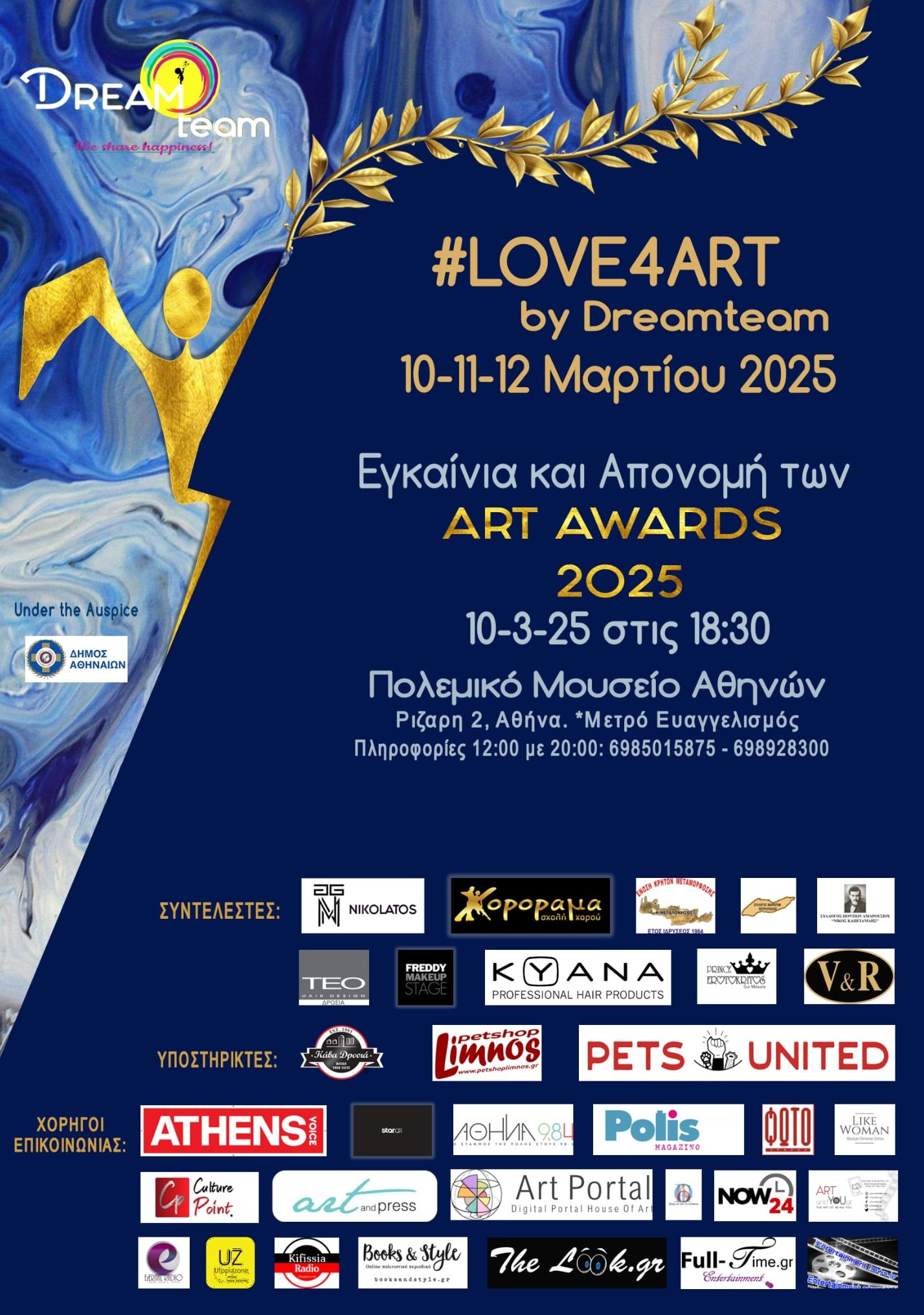 Η Dreamteam πιστή στην φιλοσοφία της προαγωγής του Πολιτισμού, διοργάνωσε για τρίτη συνεχή χρονιά τη μεγάλη γιορτή Τέχνης #LOVE4ART που στα εγκαίνια της, γίνεται και απονομή των βραβείων ART AWARDS, του Πανευρωπαϊκού Διαγωνισμού Εικαστικών Τεχνών στο Πολεμικό Μουσείο Αθηνών στις 10-11-12 Μαρτίου 2025 που τέλεσε υπό την αιγίδα του Δήμου Αθηναίων και στόχο είχε την ανάδειξη των εικαστικών Τεχνών αλλά και σκοπό την στήριξη Γυναικών που ζουν σε ιδιαίτερες συνθήκες!