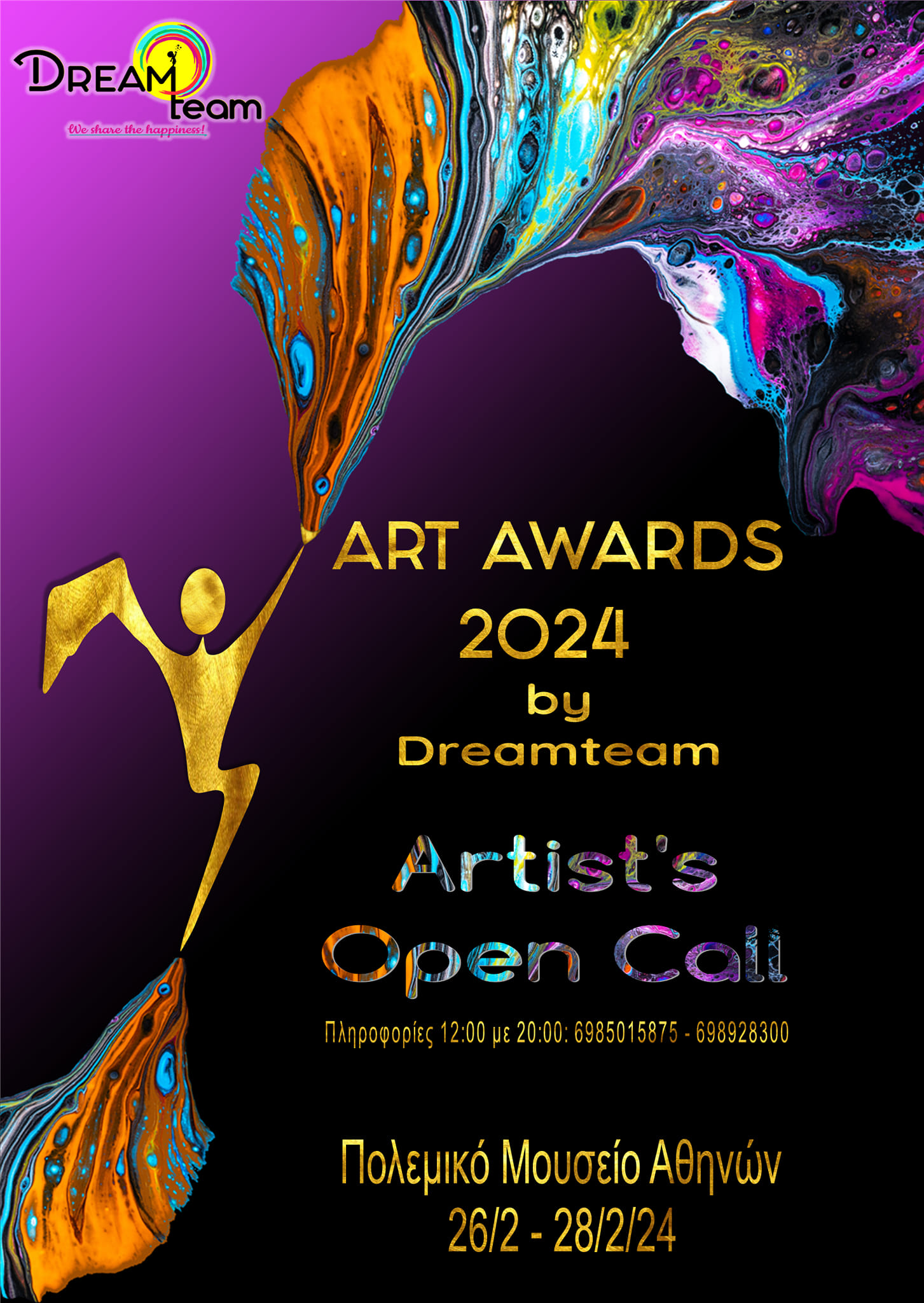 Open Call for Artist - Art Awards 2024  H Dreamteam ανακοινώνει τα ART AWARDS 2024! Θεσμό πλέον αποτελούν τα Πανελλήνια Βραβεία Τέχνης ART AWARDS της Dreamteam μέσα από το project #LOVE4ART! Μετά την λαμπερή διοργάνωση...