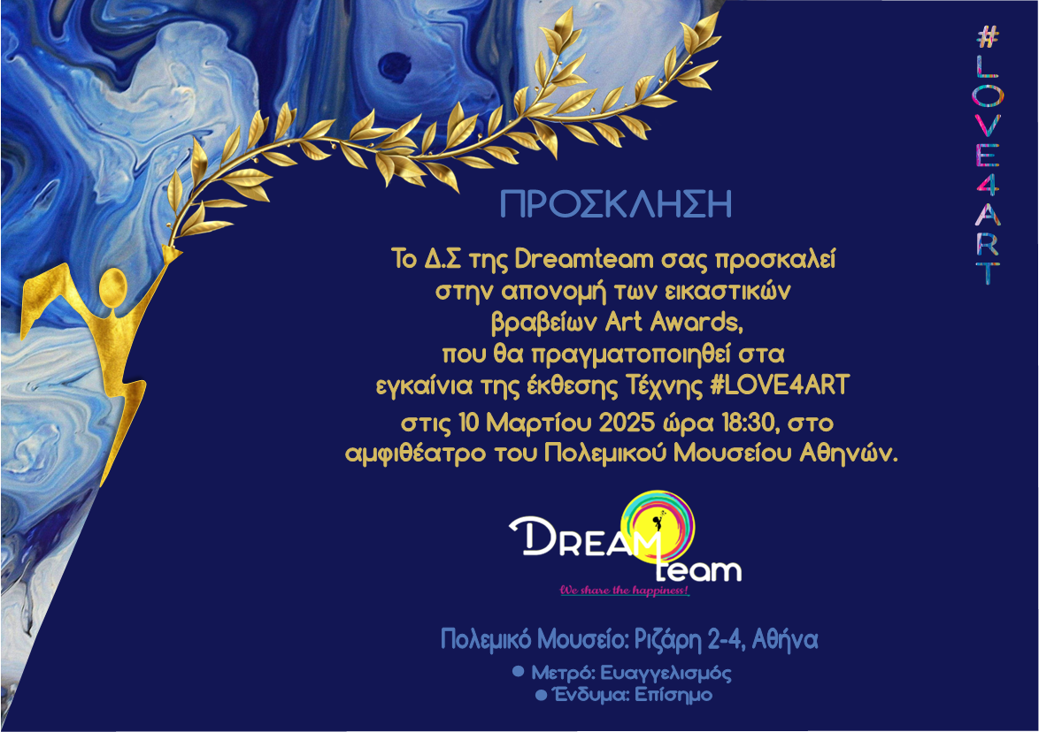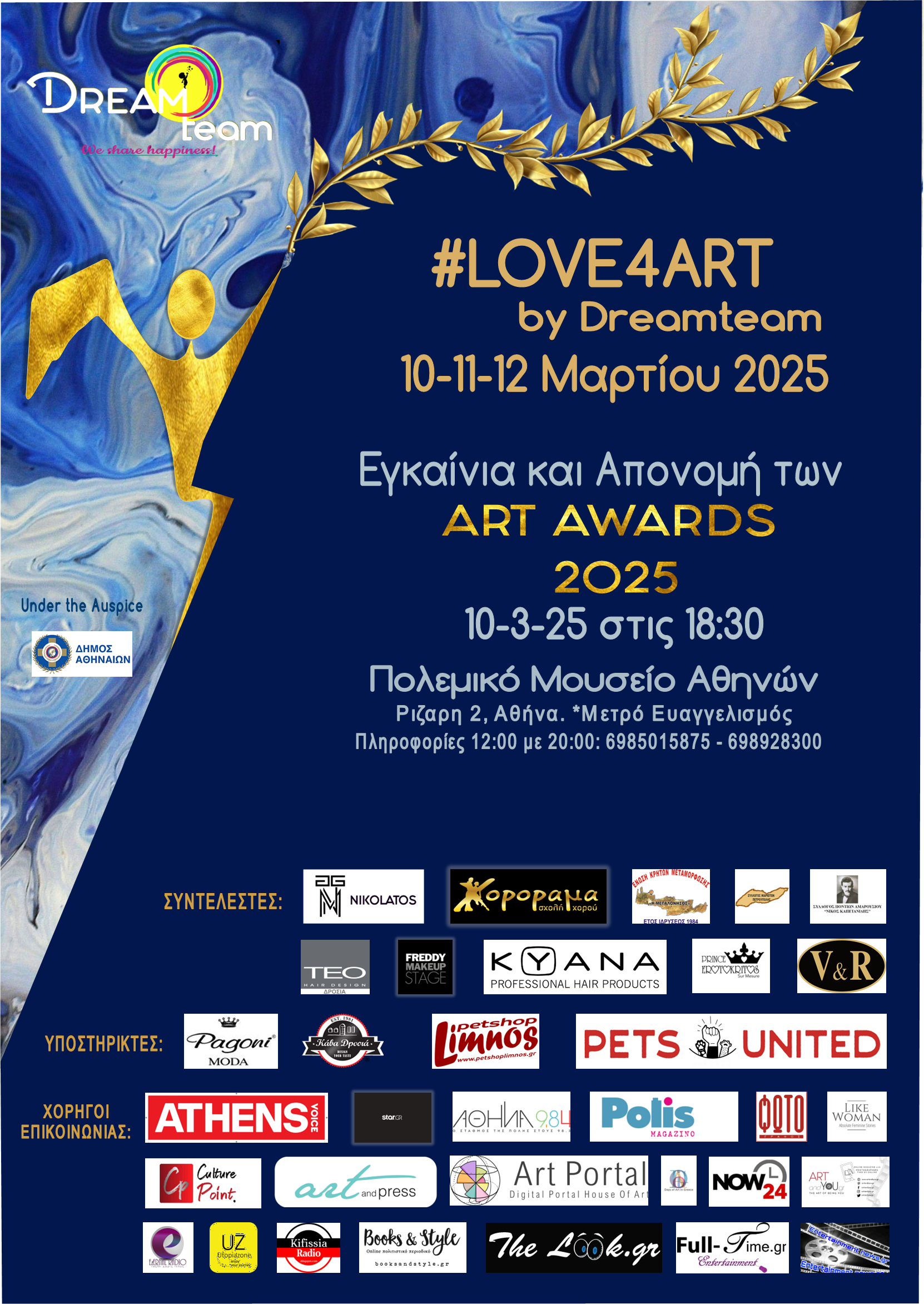 Open Call for Artists - ART AWARDS 2025 by DREAMTEAM - EUROPEAN CONTEST Η Dreamteam πιστή στην φιλοσοφία της προαγωγής του Πολιτισμού, διοργανώνει για τρίτη χρονιά, τη μεγάλη γιορτή Τέχνης #LOVE4ART...